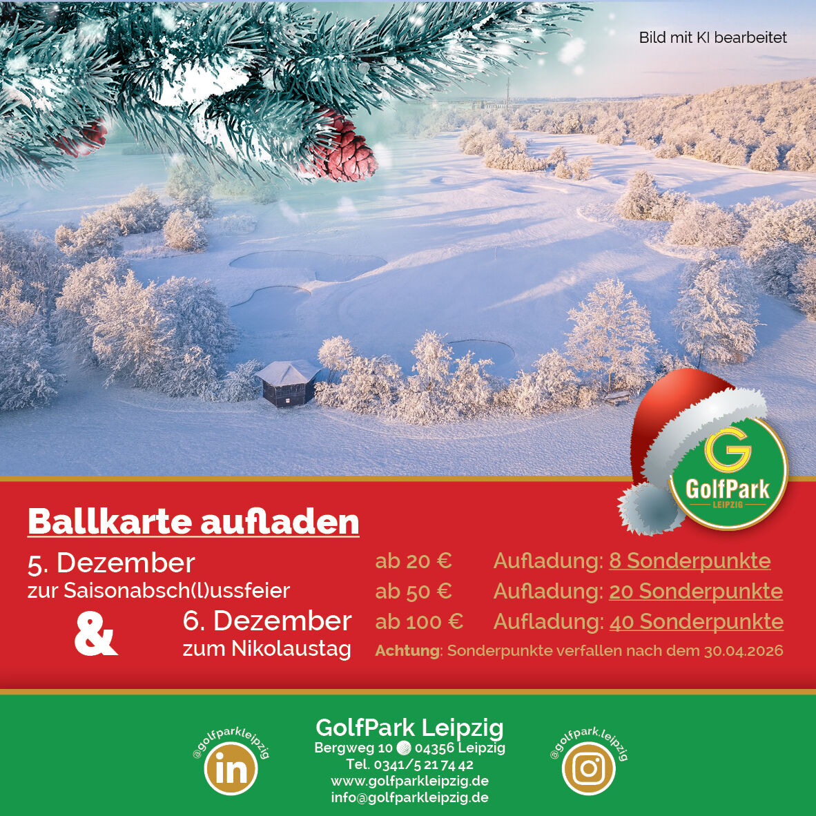 Zum Jahresende möchten wir euch etwas Besonderes bieten: An gleich zwei Aktionstagen habt ihr die Möglichkeit, eure Ballkarte aufzuladen und dabei attraktive Sonderpunkte zu sammeln. Perfekt, um die Saison stilvoll zu verabschieden – oder euch zum Nikolaustag selbst ein kleines Geschenk zu machen.